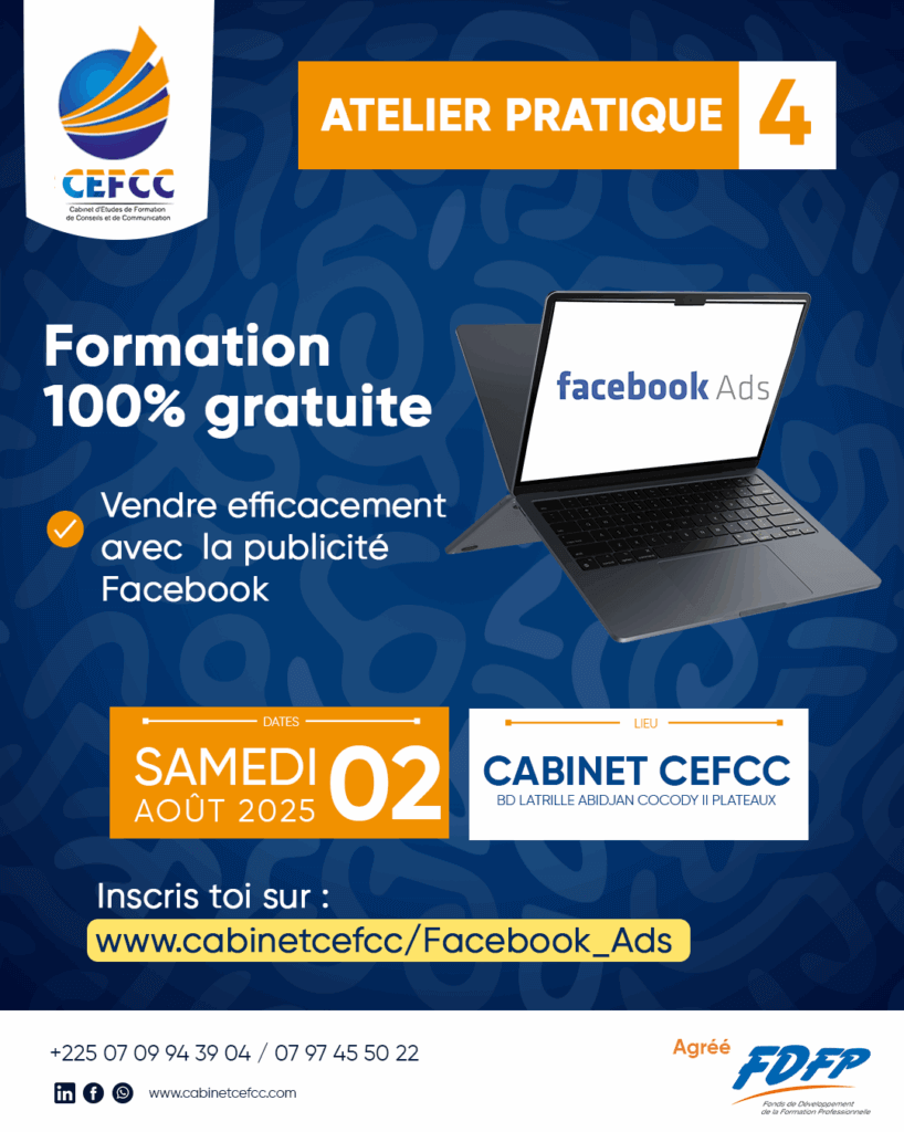 Rejoins-nous ce samedi 02 août 2025 pour une formation exclusive et 100% pratique au Cabinet CEFCC, situé à Cocody Deux-Plateaux, Abidjan.