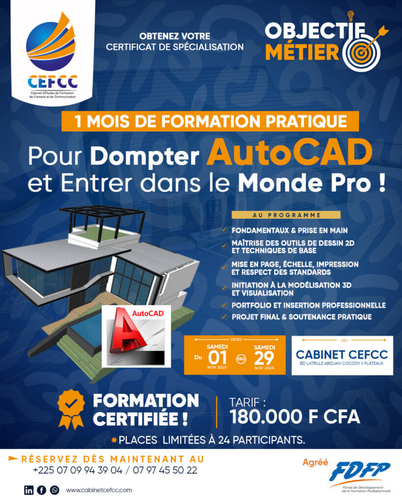 Le Cabinet CEFCC vous propose une formation 100% pratique pour maîtriser AutoCAD en seulement un mois.
